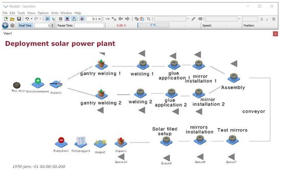 The deployment of the power plant is a task simulated by JaamSim. It involves building and deploying the solar reflectors directly on the production site. Its operation (illustrated in Figure 14) is a succession of steps transforming steel sheets into mirrors placed on motorized gantries.