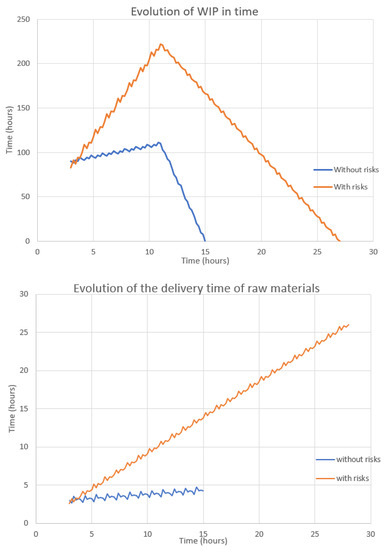 Papyrus is a modeling and simulation tool that can work autonomously. By default, the orchestration of Figure 11 can be run without the risk-management extension. Each of the tasks in the model (with the exception of the tasks referring to JaamSim simulations) has a nominal duration defined by the user. The set of these durations is determined by the engineers who estimate the average time of each steps. The uppers graphs of Figure 15 are results of each JaamSim simulations without risk management enabled. We can see that the delivery time of raw materials without risk management (bottom blue) is linear and is almost horizontal. Once risk management is activated (bottom red), we can see that WIP is degraded. The same observation can be done on the second JaamSim simulation KIP’s (top graph of Figure 15). All Papyrus tasks have thus received a temporal degradation according to various factors: