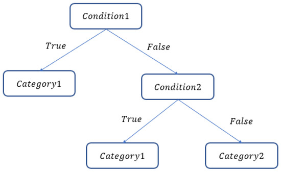 The classification and regression tree (CART) method, as developed by Breiman et al. [31], is used to process continuous and discrete non-parametric data, which can be divided into a classification tree and a regression tree according to the data type. The classification tree is used if data are discrete, and the regression tree is used if data are continuous. This decision tree algorithm continuously partitions data into two subsets by the binary method until they cannot be further partitioned, as shown in Figure 1. The advantages of CART are: (1) strong classification ability; (2) simple classification rules; (3) the continuous and discrete values are separately treated; and (4) only generate binary trees. Chen [32] points out the CART is highly suitable to select important variables.