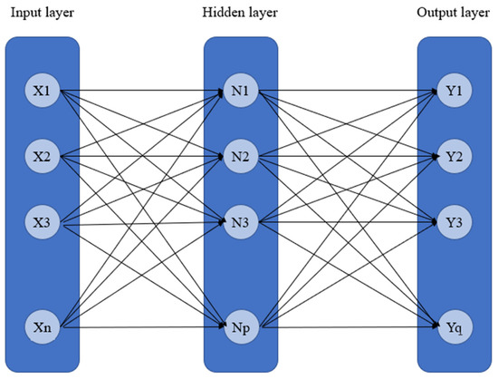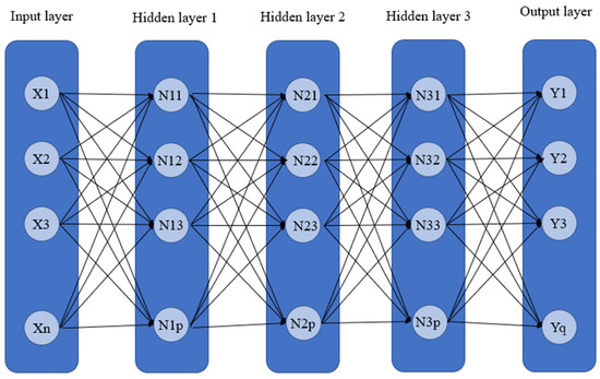 The deep neural networks (DNN) is a model developed from the artificial neural network (ANN), which has the purpose of simulating the process of the human brain learning new knowledge, thus, it is a basic deep learning model. Compared with the artificial neural network, the deep neural network has many hidden layers. Under such a structure, a deep neural network can deal with more complex problems, and is good at processing big data. The operation mode of the artificial neural network is that the data are input to the output layer for calculation by the neurons in the hidden layer, and then, the results are input to the output layer, as shown in Figure 2. In a deep neural network, more hidden layers are added on this basis, as shown in Figure 3.