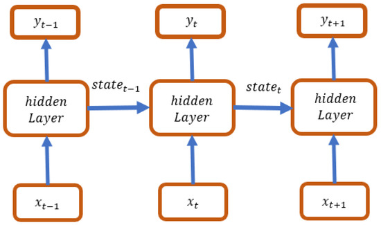 As a common sequence model of deep learning, the recurrent neural network (RNN) is used to process ordered data, and good at capturing the time dependence of sequential data; therefore, it has a high accuracy in predicting time series data. The RNN structure allows different data to be processed at each time step, while also preserving some important information, as shown in Figure 4. The results of Phase t are imported in a hidden state into the hidden layer together with the data of Phase t + 1 for calculation. The activation function used by the recurrent neural network is the hyperbolic function tanh, thus, Equation (5) is established: