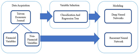 The parallel mode is adopted in this study to complete the research procedures. On one hand, 19 variables are directly used for deep learning by the DNN and RNN algorithms, and repeatedly trained to construct the best model. On the other hand, important variables are first selected by CART, which are directly used for deep learning by DNN and RNN and repeatedly trained to construct the best model. The tools (software) are used in the process of this study: data acquisition—TEJ Plus and TEJ Pro, modeling and testing—Tensorflow.Keras, confusion matrix—Excel. The research procedures are shown in Figure 5.