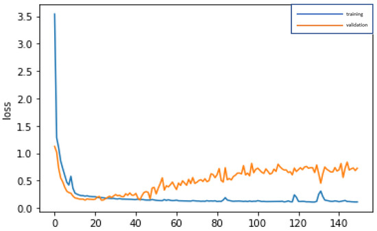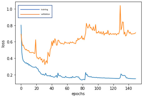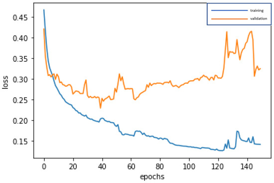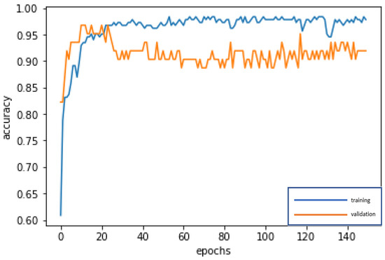 Without CART selecting the important variables, the 19 variables are directly used for deep learning by RNN, and trained and fed back until stable (150 epochs; training time: 500 microseconds), in order to construct the best model. The accuracy rates of the training dataset and validation dataset are 94.57% and 88.71%, respectively. In addition, the test dataset is used to test the stability of the model, and an accuracy rate of 90.57% is obtained, which is slightly different from the results of the training dataset and validation dataset, and indicates that the model is quite stable, Type I error rate (2.83%) and Type II error rate (6.60%), as shown in Table 10. The confusion matrix indicators of RNN, as shown in Table 11 are accuracy = 90.57%, precision = 89.29%, sensitivity (recall) = 78.13%, specificity = 95.95%, and F1-score = 83.33%. By these indicators, the performance of the model is good. In modeling, the loss function with binary cross-entropy method is shown in Figure 12. Accuracy line graph of the RNN modeling is shown in Figure 13.