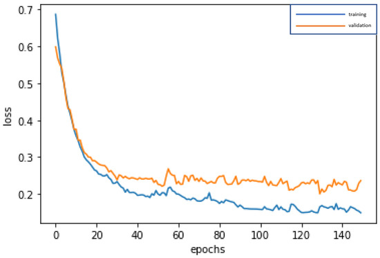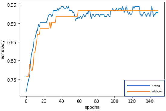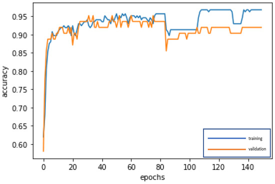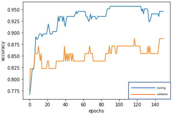 Without CART selecting the important variables, the 19 variables are directly used for deep learning by DNN and repeatedly trained until stable (150 epochs; training time: 500 microseconds), in order to construct the best model. The accuracy rates of the training dataset and validation dataset are 96.74% and 91.94%, respectively. In addition, the test dataset is used to test the stability of the model, and an accuracy rate of 88.68% is obtained, which is slightly different from the results of the training dataset and validation dataset, and indicates that the model is quite stable, Type I error rate (3.77%) and Type II error rate (7.55%), as shown in Table 8. The confusion matrix indicators of DNN, as shown in Table 9 are accuracy = 88.68%, precision = 86.21%, sensitivity (recall) = 75.76%, specificity = 94.52%, and F1-score = 80.64%. By these indicators, the performance of the model is good. In modeling, the loss function with binary cross-entropy method is shown in Figure 10. Accuracy line graph of the DNN modeling is shown in Figure 11.