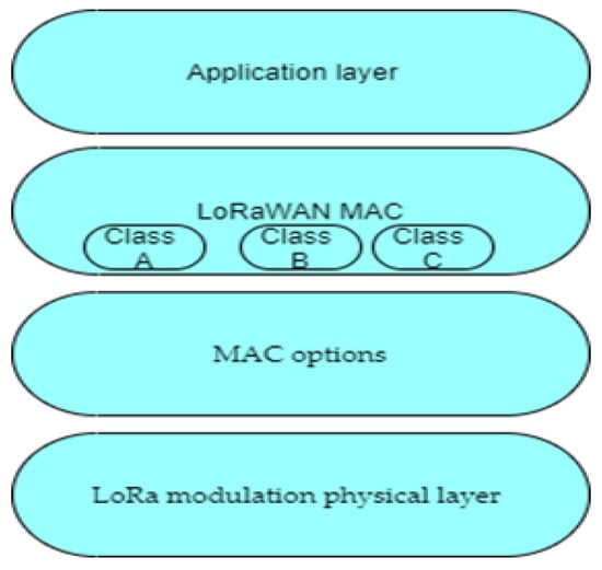 LoRaWAN is a network protocol designed for many LPWAN applications that use unlicensed frequency bands for transmission. Its standard was published in 2015 and describes the data link layer protocol, while the physical layer protocol is proprietary and belongs to the transmitter manufacturer. Figure 1 shows the defined protocol of LoRaWAN via the LoRa Alliance [].