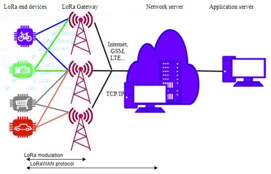 A LoRaWAN network architecture contains end devices, network servers, and LoRa gateways, as shown in Figure 2 []. The connection between the gateways and the server is reliable and fast, and the gateways are connected to sensors wirelessly using LoRa technology. The server is the coordinator of the network, and the gateways play the role of repeaters between the sensors and the server—having received a frame via a wireless connection, the gateway encapsulates the frame in an IP packet and transmits it to the server and, similarly, transmits the packets from the server to the sensors.