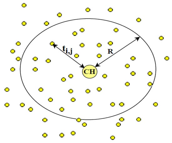 Building IoT applications provide a high-quality environment due to the massive amount of data collected through many sensors. Such sensors installed in monitoring sites will collect and analyze information about the air level, soil and water pollution; noise level, the level of reservoirs and rivers. All the information received from these heterogeneous applications generates a single LoRa network to provide a high QoS for all traffic types within the LoRa network. The QoS is measured as the packet reception ratio (PRR) function and throughput of the LoRa network. Thus, we must characterize the throughput value made in terms of the QoS. We will consider the throughput as an objective metric among the network elements tij. In our study, we also considered the head node (HN) of the cluster has already been determined without considering the clustering methods. We assumed the HN communication zone is a disk with a radius R, centered at the CH location, as shown in Figure 4.