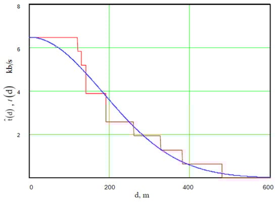 Considering the attenuation model, we depict the throughput dependency on the distance by the Gaussian function (Figure 5) [].