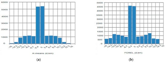 Figure 9 shows the relative distribution of nodes in the considered cluster for both considered clustering algorithms. The vertical axis in Figure 9 represents the number of nodes, while the horizontal axis indicates the relative distance between nodes and the cluster center. The negative value of the relative distance in Figure 9 shows that the nodes are located at the right side of the cluster center. As indicated in Figure 9, the main distribution of the nodes is located around the cluster center for both clustering methods.
