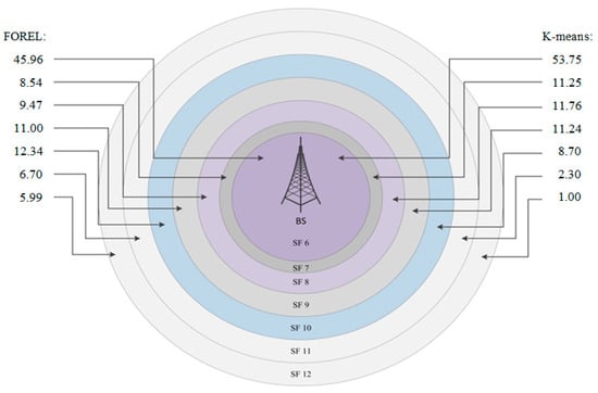 We calculate the capacity of the LoRa gateway for the two clustering methods discussed above, where the nodes are distributed differently by the area of the radio coverage zones. For FOREL = {45.96%; 8.54%; 9.47%; 11%; 12.34%; 6.7%; 5.99%} and for K-means {53.75%; 11.25%; 11.76%; 11.24%; 8.7%; 2.3%; 1.0%} as shown in Figure 11.