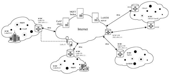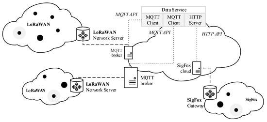 Due to their ability to offer low-power connectivity for devices distributed over a large area, Low-Power Wide-Area Networks are increasingly gaining attention. Engineering companies are in the attempt of developing a communication technology to serve as many use cases as possible. Consequently, many communication technologies are currently available, such as IEEE 802.15.4, SigFox, LoRa, Weightless, NB-Fi, NB-IoT, eMTC, EC-GSM, and DASH-7, among others []. This plethora of things and technologies will enable, for example, ports, logistics, cities, and agriculture to become smart. Therefore, a multitude of heterogeneous devices and technologies will have to be integrated in the overarching Information System using proprietary Application Programming Interfaces (APIs). Maintenance to catch changes to the APIs and to integrate them in a single back-end platform becomes a burden to the application developer and leads to scalability issues. This also happened in early Wireless Sensor Networks (WSNs), where the application layer was tied straight above the data link layer []. However, due to the efforts of the 6LoWPAN working group, middle-boxes of service providers could be decoupled, which led to easier deployment of applications and emergence of new businesses.