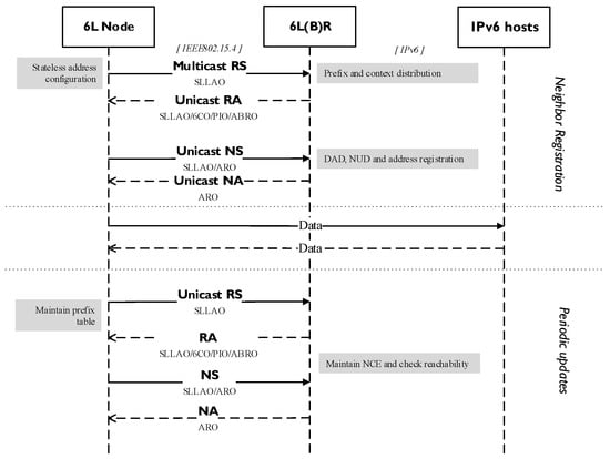 The basic IPv6 Neighbor Discovery mechanism has been optimized for 6LoWPAN networks, which resulted in RFC 6775: Neighbor Discovery Optimization for IPv6 over Low-Power Wireless Personal Area Networks, which is, however, not limited to LoWPANs. A more generic approach was presented in [], where Neighbor Discovery was applied to MultiLink IoT subnets and a backbone was incorporated to perform neighbor discovery on behalf of these low-power devices from multiple mesh networks. This optimization mainly consists of eliminating NS multicast messages to all other nodes in the network and periodic RA messages from routers. The RS/RA message pair in optimized ND is now used to request prefix and context information from the router. Every RS message creates or updates a Neighbor Cache Entry (NCE) with a certain lifetime, which should be updated by the hosts themselves with a RS message. On the other hand, the NS/NA message pair is used to perform address registration, DAD and NUD by a central IPv6 ND Registrar on behalf of the host []. The Neighbor Registration and Periodic Updates section of Figure 3 give an overview of the optimized ND protocol.