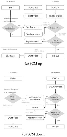 As depicted in Figure 4a, every SCHC packet arriving at the Network Gateway, is decompressed first. The return value of the decompressor is then passed to the SCM, where either