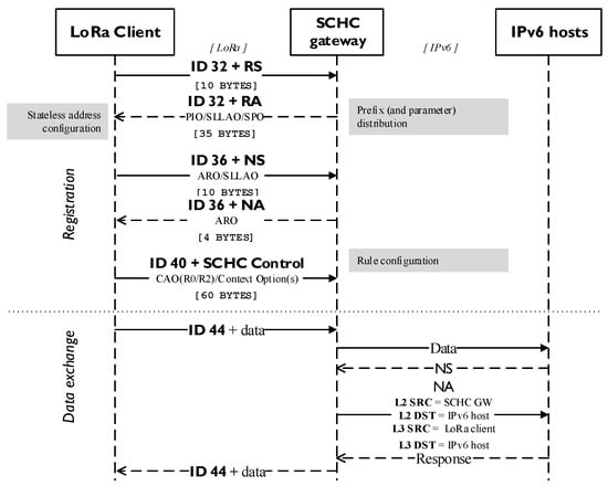 The other proposed solution builds entirely on existing standards and uses SCHC to compress Optimized Neighbor Discovery messages. In order to perform ND, the SCHC router implements a Neighbor Cache—similar to 6LoWPAN routers—which behaves as a registry for all host addresses attached to the router. In order to request IPv6 prefix information of the network, a sensor device configures a link-local IPv6 address and broadcasts a RA. The RA contains a Source Link Layer Address Option (SLLAO), MTU, and Prefix Information Option (PIO). The PIO can be used to perform stateless address autoconfiguration. Next, a NS carrying the ARO option is sent to the SCHC gateway in order to register an IPv6 address and a lifetime. The lifetime should be chosen reflecting the behavior of the node, i.e., the registration should be maintained even while the host is sleeping. This method therefore assumes that sensor devices repeat the ARO before their lifetime runs out. The complete flow for performing Neighbor Discovery and updating the SCHC context (which will be explained in the next Section) is given in Figure 5. Once a sensor device starts the Neighbor Discovery process by sending a RS, its state machine behaves such as regular Optimized ND. A timeout lets the device notice a lost or erroneous Router/Neighbor Solicitation or Router/Neighbor Advertisement. The responsibility for a retransmission strategy lies on the device.