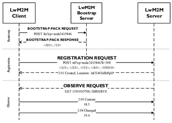 Another IoT management protocol has been developed by the Open Mobile Alliance (OMA) and goes under the name of LightWeight Machine-to-Machine (LwM2M) []. The LwM2M protocol defines objects, resources, and instances on top of CoAP in order to limit the protocol overhead when querying well-known resources from a sensor device. Apart from information reporting, also bootstrapping, device registration and ways to perform device management are present in the specification.