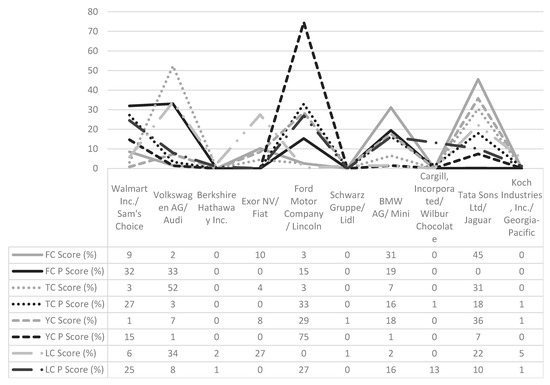 From the point of view of the presented findings, we can state that in the Advanced sentiment analysis (ASA) the parent companies reached maxims at the level of almost 90% of the possible reputation. In contrast, the lows were at a level of just under 20%. The average is around 49% of the potential. In terms of the overall level of reputation, (TOR) entities reach their maximums at 45%, the minimums are at 5%, with an average value of 18%. We will discuss the findings in more detail in the Discussion section. Regarding the data measured for selected brands of parent companies, the situation is as follows: