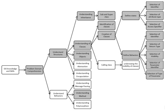 Karmer [26] proposed the OOP’s competency structure model and evaluation instruments. To measure the student’s competencies in OOP, the proposed model includes two major components: (1) a set of candidates for (potentially measurable) competencies, and (2) a category system that supplies a structure for these competencies. The model has four dimensions and sub-dimensions, i.e., 1. OOP knowledge and skills (competencies required for acquiring core programming knowledge and skills); 2. mastering representation (competencies required to understand any system’s formal description, such as syntax or the semantics of any programming language); 3. cognitive process (competencies related to the problem-solving stage, such as understanding the problem, determining how to solve the problem, translating the problem into a computer language program, testing, and debugging the problem program); and 4. metacognitive processes (it includes factors like volition, motivation, self-efficacy, perceived understanding, or theoretical values).