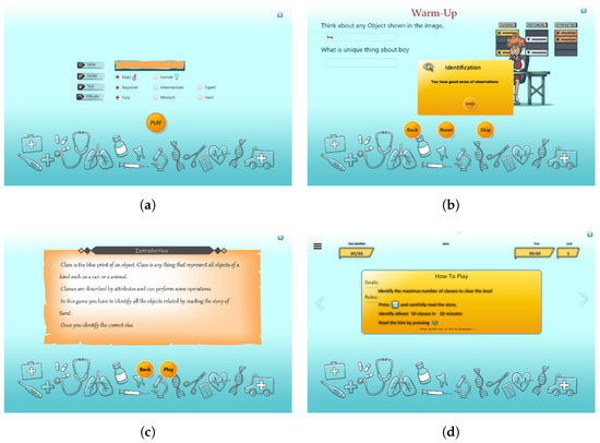 The developed 2D game is named as Object Oriented serious game (OOsg), The motivational point behind the design and development of OOsg is to provide an SG environment, in which the novice programming students or the students who have difficulty in the conceptualization of fundamental quarks of OOP can start learning interestingly and engagingly. The students can improve their concepts, especially the concepts of classes, attributes, methods, objects, and inheritance using developed SG. The post-test was used to provide the proof of the validity of the learning outcomes using the developed prototype. OOsg starts by providing the personal and control information in which the user has to select the type of player, i.e., basic, intermediate, or expert, to define the size of the solution model. Students may also choose the difficulty level, i.e., simple, medium, or difficult, for defining the time limit for completing the solution, as shown in Figure 3a. The SG incorporated three different stories as playing scenarios, which include the hospital management system, library management system, and the online shopping system. Before starting the game, the students were presented with a warm-up session, as shown in Figure 3b to provide an idea of the environment in which they will play the game. After the warm-up session, the actual game began. Each level of the game begins with a brief introduction to the topic as shown in Figure 3c, and the rules and goals for playing the game as shown in Figure 3d, which were supposed to be achieved at a particular level. The activities provided in the game environment are based on stories related to the problem domain selected at the beginning of the game. Each activity includes a comprehensive learning and assessment program for the student. Every interaction students made with the game is also captured and stored in the game’s log file and an increase or decrease in score in the scoreboard, and provided with appropriate and tailored feedback, respectively.