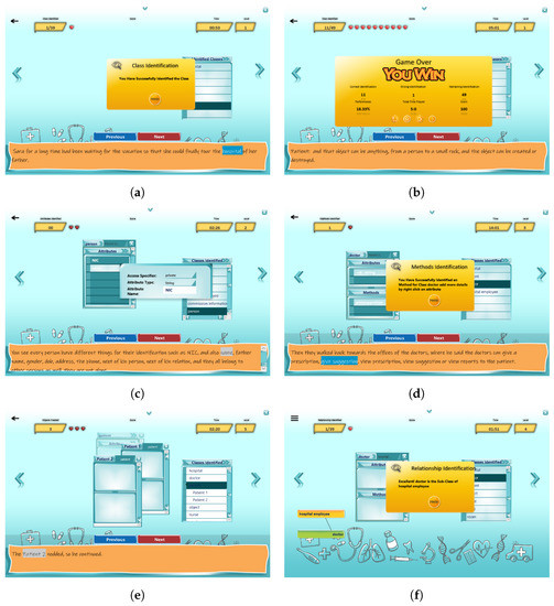 Game levels include: (a) Level-1—learning about the class identification. Taken from [38]. (b) Statistics/evaluation of the Level-1. (c) Level-2—learning about the attributes of the identified class. (d) Level-3—learning about the methods of the identified class. (e) Level-4—learning about the objection creation. (f) Level-5—learning about the relationship between classes.