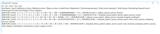 The log files are generated once the user creates their profile shown in Figure 3a. This file keeps all the interactions that players made with the game: the first row shows the variable names for which data are gathered from OOsg, while the remaining rows show the values received for those variables. The example log file for Level-1 is shown in Figure 5; in this example, detailed information about players attempts such as how many time the player attempted to select the attributes, method, or object as a class, what is the total number of classes a player is supposed to identify, and how many classes are remaining will be recorded. The log file records many other concrete details such as total wrong and correct attempts, score, performance (calculated as correct attempts/total No of Solutions × 100), total time played, date and time of playing, and correctly attempted solution. The log file is generated locally for the player of each level in a separate file. The information recorded in the log file helps to evaluate the students, who learned basic OOP concepts using OOsg.