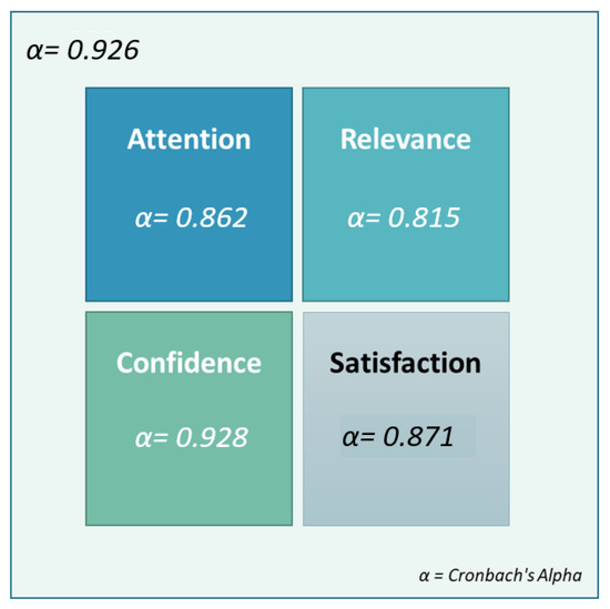 Learner’s perception of their motivations refers to how they perceive their motivations while playing OOsg. Although we cannot measure players’ direct motivation by any scale, we can estimate players’ perceived motivation. Students of both groups evaluated the learner’s motivations. The quantitative data were generated using scale Instructional Materials Motivation Survey (IMMS). The four subcategories of the IMMS scale include attention, relevance, confidence, and satisfaction. The mean alpha reliability of their subcategories and overall scale is shown in Figure 7. The quantitative analysis of these subcategories is as follows: