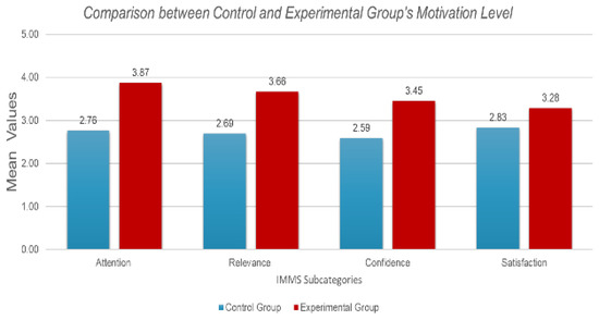 The comparison between the average score for all the IMMS scale subcategories for both the control and experimental groups is shown in Figure 8. The comparison results revealed that the experimental group students’ motivation levels were positive for all the subcategories of IMMS.