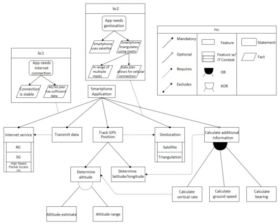 To understand the functional requirements for the smartphone application and the relationships between each feature, a feature model has been created shown in Figure 3 [27,28]. The key features are branched off from ‘smartphone application’ to show the high-level features, which are linked by either a mandatory or optional line. The features can be broken down into sub-features or even provide a choice to accomplish the task, as seen on ‘Determine altitude’ XOR is used to show the system can either choose ‘Altitude estimate’ or ‘Altitude range’ but not both.