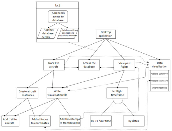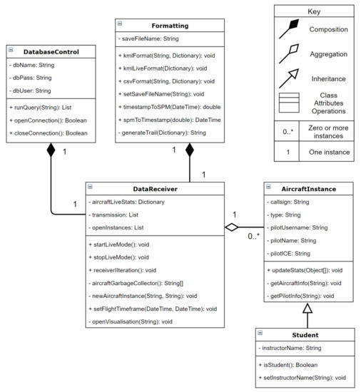 Creating the class diagram given in Figure 5 has expanded the system requirements by highlighting key functionality which would not have been considered by the focus group. For example, ‘aircraftGarbageCollector()’ in class ‘DataReceiver’ was not considered previously. If the application is running for an entire day, it would become necessary to remove aircraft which have not sent any transmissions after a while. If this were not performed, memory would be unnecessarily used, slowing down the application, as well as causing the virtual map to become cluttered with old aircraft trails. This proposed method will look at each aircraft’s last timestamp and if it is more than 5 min old, then the aircraft would be removed. Another feature should be a student aircraft instance, where everything is inherited from the regular aircraft instance, but includes some additional instructor information and an operation to check if a particular instance is a student pilot, which could be used as a filter in the application.