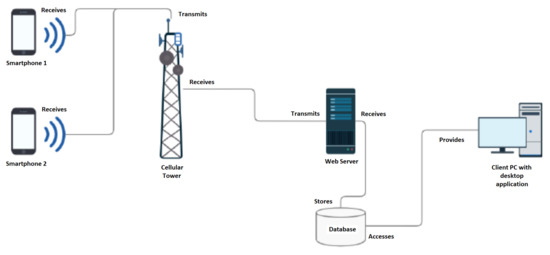 The diagram demonstrates the relationship between the components. The smartphone, which would be in an aircraft communicates using the cellular network to transmit flight data. The cellular tower can then transfer the data to the web server, which can then store the transmission in the web server’s database. This database will continue to store information regardless of the desktop application, as the two are separate components. For the desktop application to view live tracks, the desktop application must connect to the database and request new transmissions. Because the database is always accepting new transmissions, the desktop application can be opened to obtain old flight data, which has been recorded.