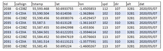 - Schäfer, M.; Strohmeier, M.; Lenders, V.; Martinovic, I.; Wilhelm, M. Bringing up OpenSky: A Large-Scale ADS-B Sensor Network for Research. In Proceedings of the 13th International Symposium on Information Processing in Sensor Networks, IEEE, Berlin, Germany, 15–17 April 2014; pp. 83–94. [Google Scholar]