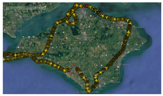 The data produced was highly accurate, with every turn recorded precisely and frequently, because when the view to see all transmissions is enabled, the tracks are consistent throughout, with very few transmissions lost, even when the aircraft was over 3000 ft. Figure 21 displays each aircraft icon as a separate transmission to note the consistency of transmissions throughout. The exception are the areas with a red circle around, the exact reason for the missing transmissions is unknown. A presumption is poor cellular connection.