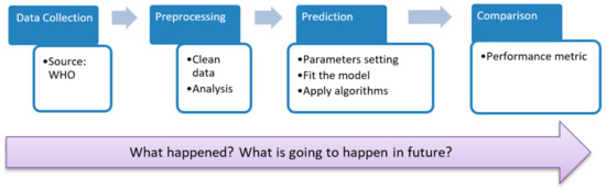 The study was carried out in several phases. First, data were collected from the World Health Organization (WHO) and John Hopkins University, which obtain data from different organizations. After this, the data were analyzed and preprocessed in order to avoid any duplicate or missing values. Numerical tests were performed using Python and R and executed on an Intel® Core i7-4510U, 2.0 GHz, 8 GB, DDR3 Memory computer (Supplementary File). The flowchart of the research methodology is provided in Figure 1.