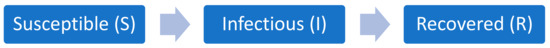 This section introduces the classic form of the SIR model [20,21], which is used to describe the transmission of COVID-19 in Australia, Italy, and UK. The flowchart of the SIR model is presented in Figure 2.