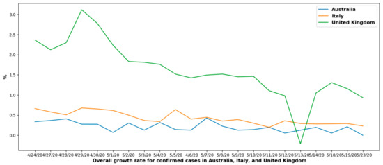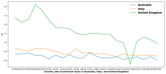 In this subsection, the confirmed growth rates in Australia, Italy, and UK were calculated for every day from 24 April to 23 May 2020. Figure 4 depicts the growth rate of confirmed cases in these countries. As can be seen, the growth rate for Australia remained below 0.5 during times of outbreak and was just above 0.0 at the end of May, while the rates for Italy and UK were generally high. The growth rate for UK was almost above 2.0 in April, and then dramatically declined in May. The rate for Italy fluctuated between 0.5 and 1.5 in April and May.
