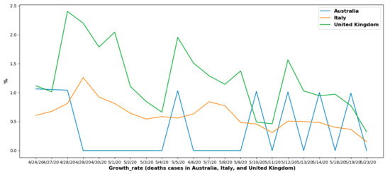 Figure 5 presents the growth rate of death cases for the above-mentioned countries, according to daily data from 24 April to 23 May 2020. The growth rate for death cases in Australia fluctuated between 0.0 and 7.0 in April and May and reached 7.0 at the end of April. During the same period, the rate remained almost below 2.0 in Italy, and in UK, the rate was just below 4.0 at the end of April and just above 0.0 at the end of May.