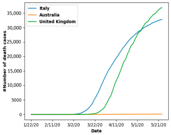 Figure 6 illustrates the overall growth rate for confirmed cases in the studied countries. Negative numbers indicate that people recover faster than the rate at which they get sick, which is good news. The rate for Australia in the time period remained almost below zero and then changed from −15 at the end of April to just below −5 at the end of May. For Italy, the rate fluctuated between just above −7.5 and just above 0.0, while the rate for UK remained almost consistently positive in the time horizon (0.0–3.0). Figure 7 illustrates that the number of death cases in Australia is significantly lower than the other two countries.