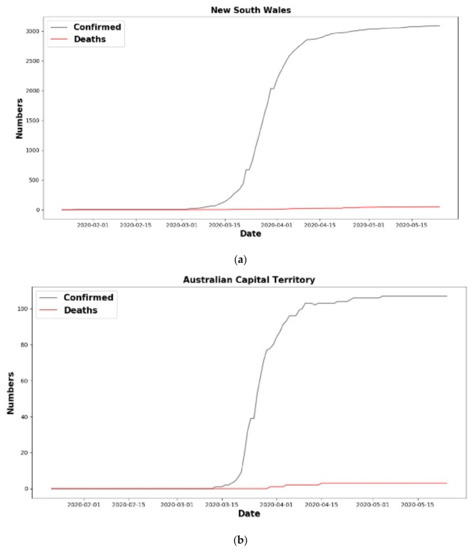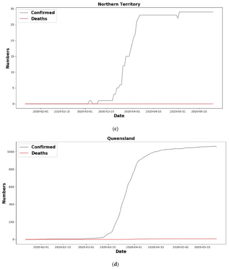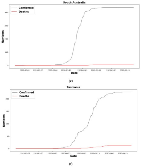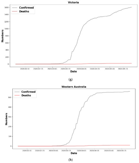 Figure 8a–h shows confirmed cases versus death cases in each Australian state. By 23 May 2020, New South Wales and Northern Territory possessed the most confirmed and the least death cases in Australia, respectively. In Figure 8a–h, the number of confirmed and death cases in New South Wales significantly differed from other states in Australia and increased dramatically, while the Northern Territory experienced some fluctuation during the study time period.