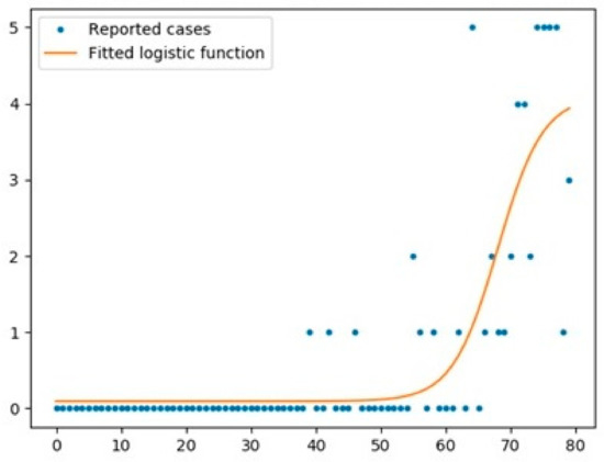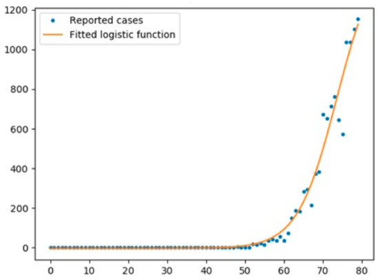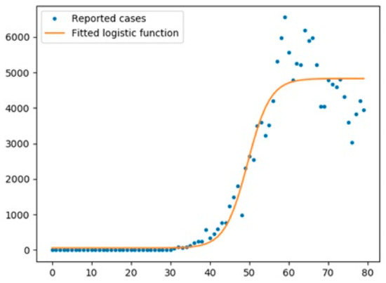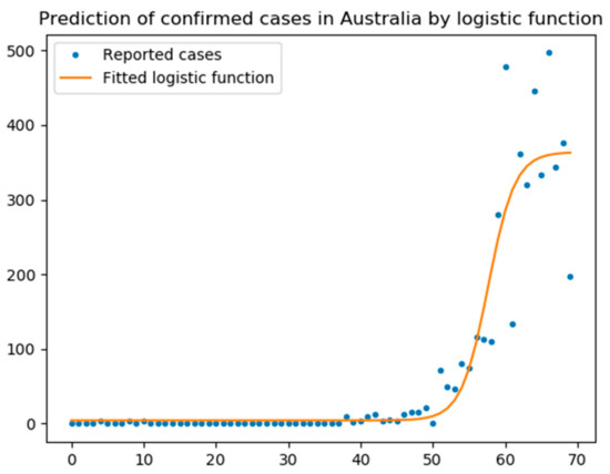 With the aim of forecasting, the logistic function defined in Equation (11) was applied to the collected data (time horizon: start of outbreak in the countries). According to the results in Figure 9, Figure 10, Figure 11, Figure 12, Figure 13 and Figure 14, the logistic function is fitted to the trend of increasing cases to evaluate the performance of metric R2 scores used for confirmed and death cases. Results are presented in Table 1. The root mean square error (RMSE) was used as another metric to analyze cases, and the results in Table 2 show that the best RMSE value belongs to the Australian cases (confirmed and death).