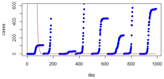 Figure 15, Figure 16 and Figure 17 present the results of the classic SIR model. As previously mentioned, the controlling parameter indicates the level of disease transmission, and is the recovery (removal) period indicating how many people could recover in a certain period. First, all parameters were initially added to the SIR model, which was then applied to real data. As can be seen in Figure 15, Figure 16 and Figure 17 and Table 3 (RMSE values), the classic SIR form was not suitable for predicting the COVID-19 pandemic in these three countries. In order to fit the SIR model to Australia, Italy, and UK, an optimizer was needed to find the unknown parameters ( and ) from equation () since these parameters could be estimated. Prior to the outbreak in these countries, it is essential to address whether the number of susceptible cases is equal to the population due to the absence of antibodies and vaccines for the disease. At first, = 2.7 was fixed (reported by Australian Government: Department of Health) as the median number, , and .