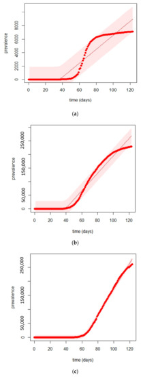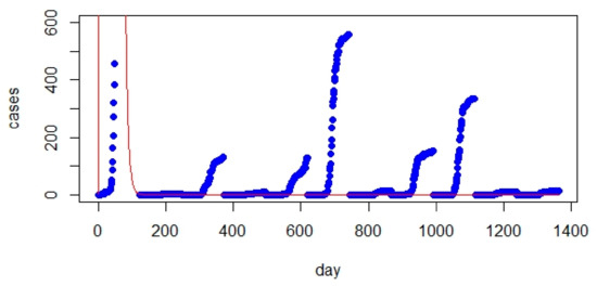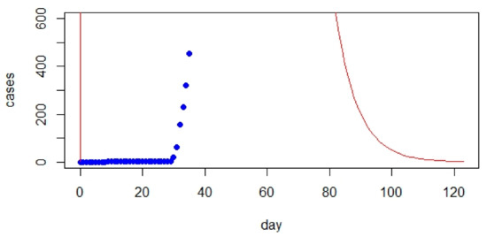 Real data were applied to estimate the values of and . An optimizer was used to find the best estimation of and . The optimization algorithms used were the Broyden–Fletcher–Goldfarb–Shanno (BFGS) [30], limited memory bound constrained BFGS ( L-BFGS-B) [31], conjugate gradients (CG) [30], and Nelder–Mead algorithms [32]. The parameter settings are provided in Table 3. The flowchart of the improved SIR and SEIQR versions and parameter settings for the above-mentioned algorithms are addressed in Figure 18 and Table 4, respectively.