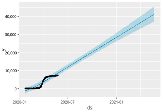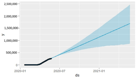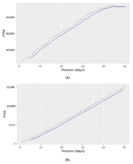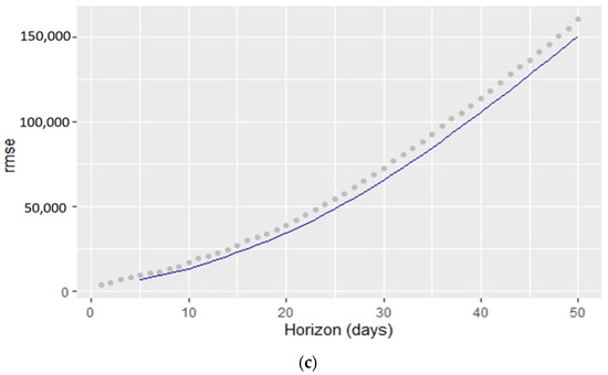 Figure 20, Figure 21 and Figure 22 reveal the forecasted values obtained using the Prophet algorithm, where the algorithm is fitted for the cases of Italy and UK but has errors for Australia. Table 7, Table 8 and Table 9 present the results of the predicted cumulative confirmed cases using the Prophet algorithm in the three countries, where y represents the true values of confirmed cases, ds is time, is the forecasted values, and and are the lower and upper bounds for the forecasted values, respectively. It should be noted that the forecasted values were determined between the cutoff and cutoff + horizon. Table 7, Table 8 and Table 9 are also cross-validation matrices that are used to find the error values between y and , from which the RMSE values can be obtained (Figure 23a–c).