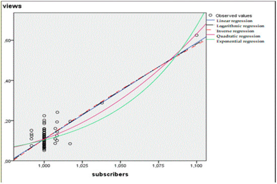 To identify statistically significant factors that affect certain variables, we used the appropriate tools of SPSS and MS-Excel software, in particular, we synthesized equations of linear and nonlinear pairwise regressions, as well as multiple linear regression. The authors considered the following five types of nonlinear pairwise regressions: logarithmic, exponential, quadratic, cubic, and inverse. Seven variables were analyzed: “relative number of visits”, “relative number of subscribers”, “relative subscriber reach”, “relative number of orders” (for marketing communities), “relative number of likes”, “relative number of reposts”, and “relative number of comments”. The first four variables, of the above, could be both dependent and independent ones on a separate case-by-case basis. The other three variables were defined by the authors as independent ones. If any of the variables was defined as a dependent one in a pairwise regression, the other six variables were analyzed alternately as independent ones. In the case of multiple regression analysis, the authors considered all possible combinations of independent variables. The statistical significance of the regression coefficients was checked using Student’s test, and the significance of the equation as a whole was determined according to Fisher’s test.
