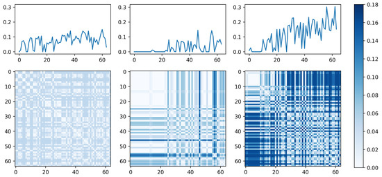 Examples of recurrence plots generated from the RPCNN model. From left to right: uncorrelated stochastic data, data starting to grow, and stochastic data with a linear trend. The top row shows the signals before the recurrence plot generation, and the bottom row shows the corresponding recurrence plots.