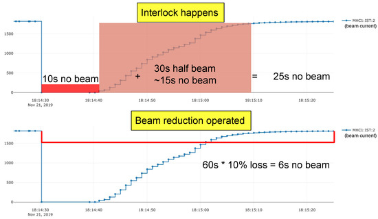 Expected lost beam time without (top) and with (bottom) the proposed 10% current reduction. An interlock equivalently leads to 25 s of lost beam time, i.e., s of beam time saved. With the current reduction, the interlock is expected to be avoided with a cost of six s of lost beam time, i.e., s of beam time saved.