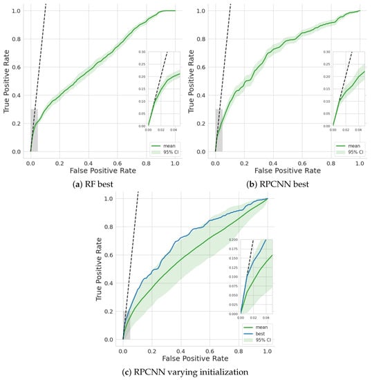 ROC curves of the best-performing models in terms of Beam time saved and AUC: (a) RF; (b) RPCNN. The mean and 95% confidence interval is calculated from re-sampling of the validation sets. (c) Varying initialization of the same RPCNN model as in (b). The mean and 95% confidence interval are calculated from the validation results of 25 model instances.