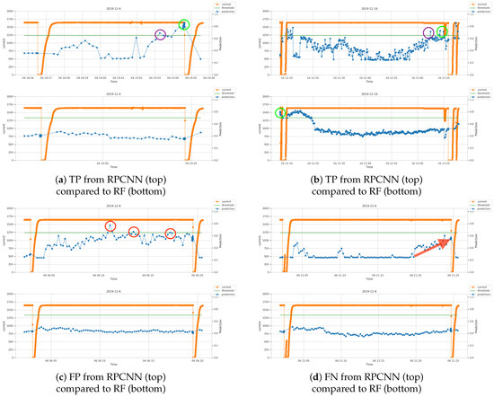 Screenshots from simulated live predictions over the validation data. The blue line is the prediction value from the model, with higher values indicating higher probability that interlocks are approaching. The orange line is the readout of the beam current channel “MHC1:IST:2” where a drop to zero indicates an interlock. The green line is the binary classification threshold, here taking for the RPCNN and for the RF. (a,b) show two examples of successful prediction of interlocks by RPCNN compared to the result of RF on the same time periods. The positive predictions closer to interlocks are regarded as TP marked by green circles, and the earliest times that the model output cross the threshold are enclosed in purple circles. (c) shows the FPs from the RPCNN in red circles, compared to the result of RF. (d) shows an example of FN from the RPCNN compared to the result of RF. A clear trend increasing with time is present in the output of RPCNN, shown by the red arrow.