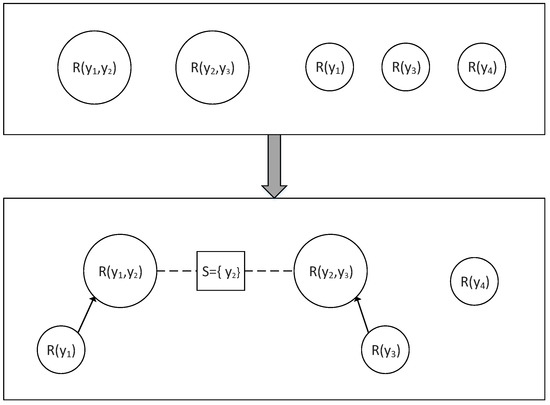 Suppose that a rule r contains the relations and denotes the variables in . We call irreducible if , ; otherwise, there exists a relation with , and can be reduced to . An irreducible group consists of an irreducible relation and all the relations reducible to , and we denote it by . The set of predicate variables shared by two or more irreducible relations is called a joint variable set, denoted by S.