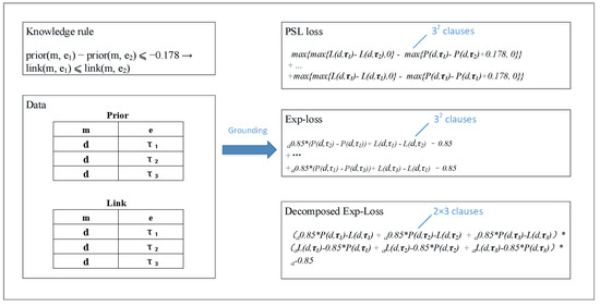 We provide an example of the comparison between our framework and PSL in the Figure 3. In this example, we selected hybrid knowledge used in our experimental study for entity linking, to demonstrate the loss functions in three scenarios: the original PSL hinge-loss and the exp-loss with and without loss decomposition. As shown in the figure, the rule consists of two first-order relations. Each relation in the dataset has three instances. Since PSL does not support hybrid rule inference, we show the loss function when the linear inequality is directly regarded as a logical variable. It is easy to observe that the original PSL loss function cannot guarantee convexity. The decomposed exp-loss function reduces the number of clauses from to .