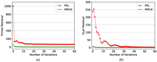 Evaluation of convergence on NMLN vs. PSL: (a) primal residual; (b) dual residual.