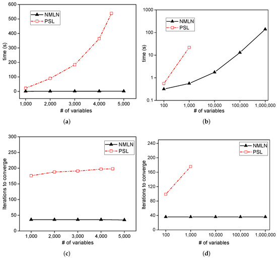 We also present the number of iterations required by both techniques to converge in Figure 5c,d. It can be observed that the NMLN takes 36 iterations on all the tasks with the number of variables varying from 100 to 10 M. The reason is that the average size of the local variables with respect to the same global variables is always a fixed number in the NMLN. In PSL, clause explosion causes a single variable taking more local copies when the size increases.
